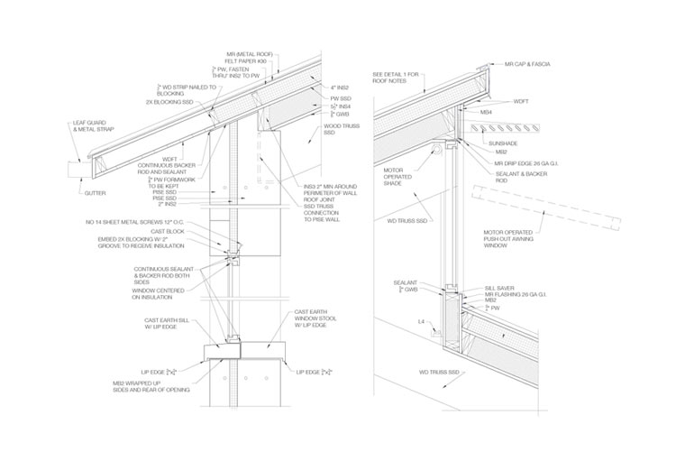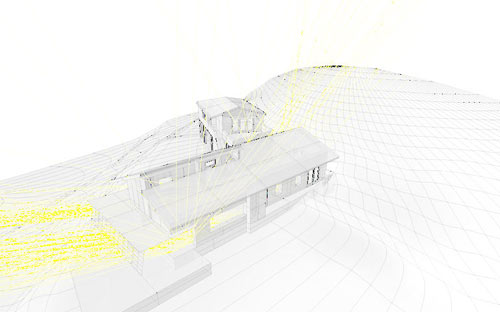 The house is surrounded by vineyards, set in the hillside with stunning views overlooking the Russian River Valley. It is made up of two parts, a single story 80-foot long main house and a more compact two story guest apartment and garage arranged in an āLā plan. The main house faces due south with a hipped roof aligned east/west, maximizing natural light and allowing for a large photovoltaic area on the roof. Its walls are 18ā³ deep and constructed of PISE āa sprayed earth & cement mixture. The house will feature exposed reclaimed timber roof trusses in the open living area.